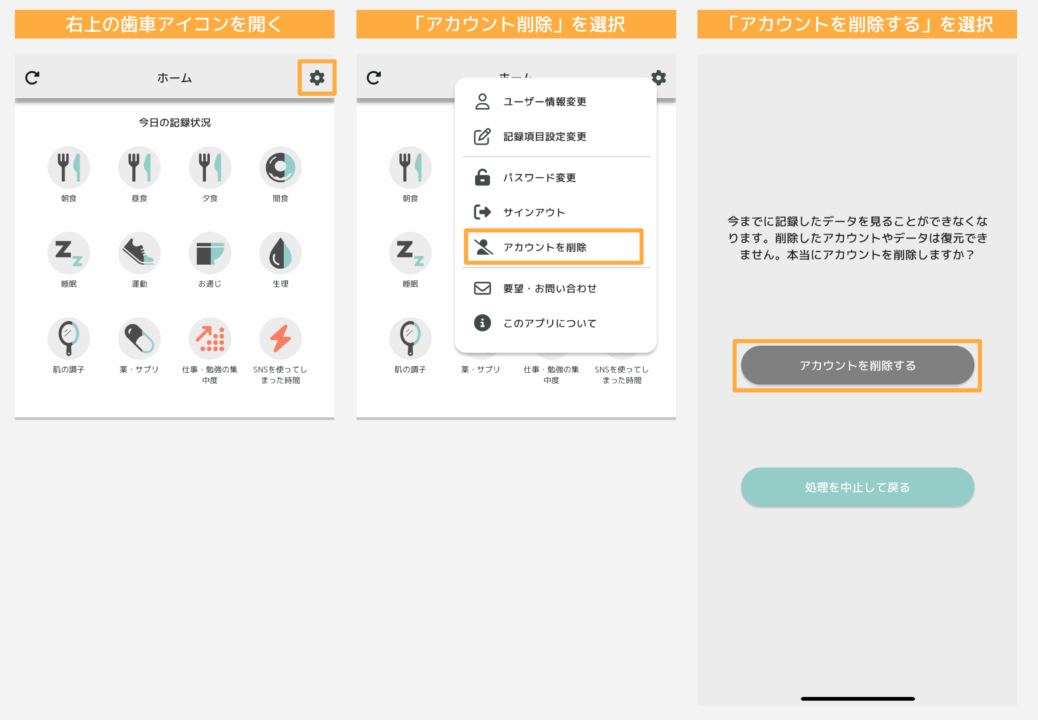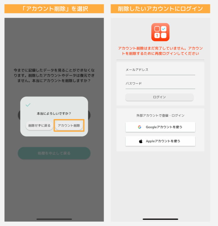 この操作により、アカウントに関連するすべてのデータ(ユーザー登録データ、記録データなど)が削除されます。データは復元することができません。